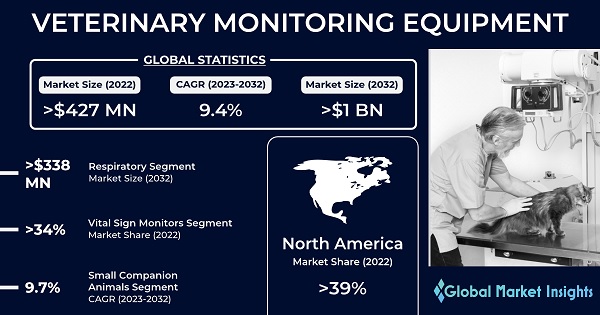 Veterinary Monitoring Equipment Market size accounted for USD 427.5 million in 2022 and is estimated to grow at 9.4% to reach USD 1 billion by 2032. Increasing prevalence of animal disorders, growing companion animal population, and increasing spending on pets health are some of the drivers fostering the market growth.